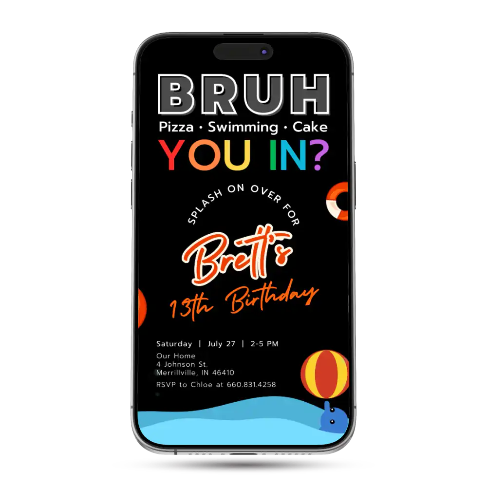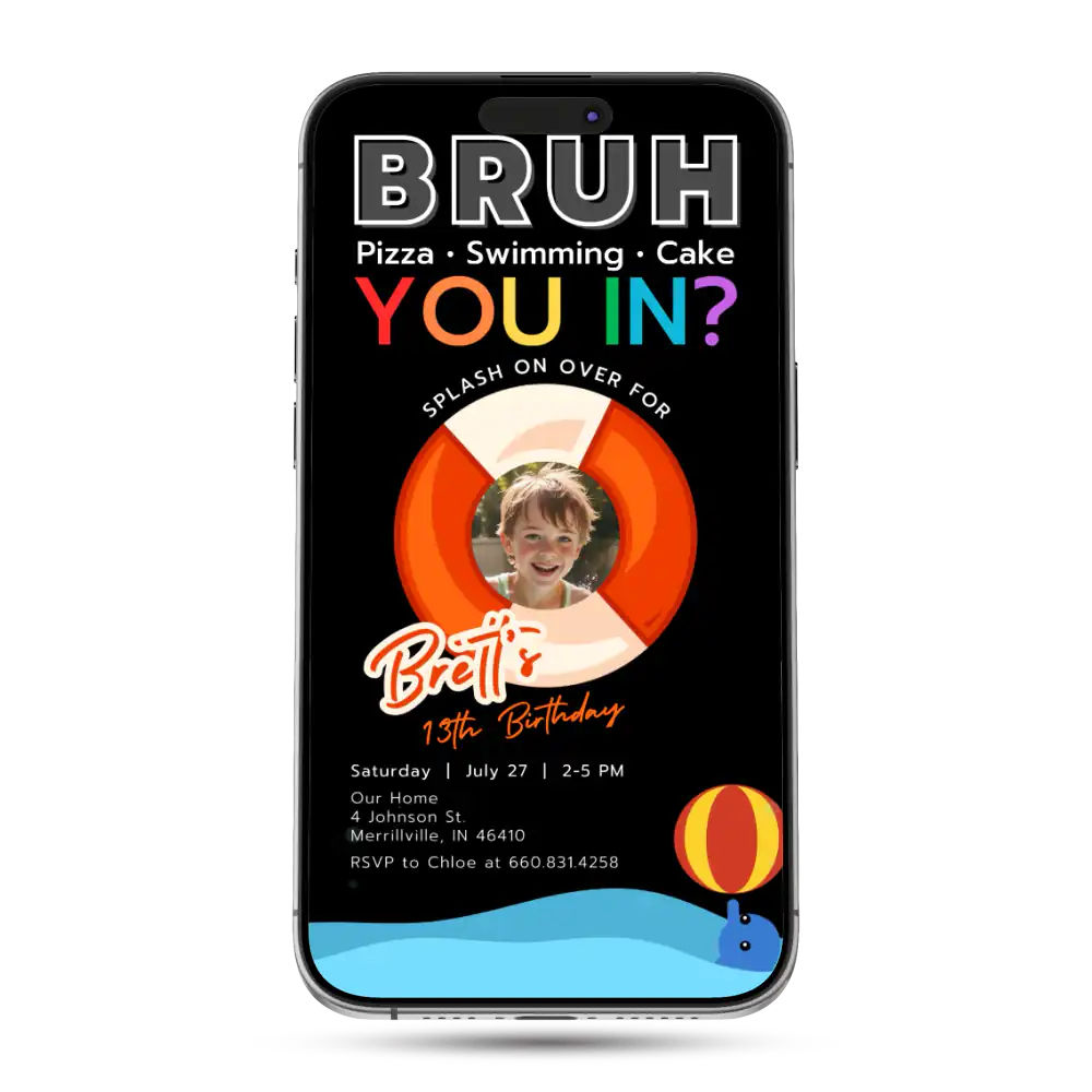 Dive into birthday fun with our "Bruh you in?" Pool Party Invitation template! Perfect for boys of any age, this cool design sets the tone for an epic poolside celebration.